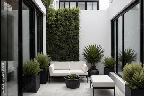A modern minimalist patio with plants and outdoor furniture