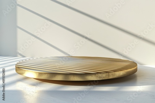 a modern, minimalist scene featuring a round, golden stage podium. The podium has a smooth, ribbed texture on its surface and is bathed in soft, natural light.