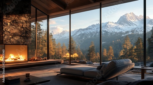 A modern mountain retreat with a sleek lounge chair and a roaring fireplace, large glass wall showcasing a panoramic view of towering pine trees and distant peaks,