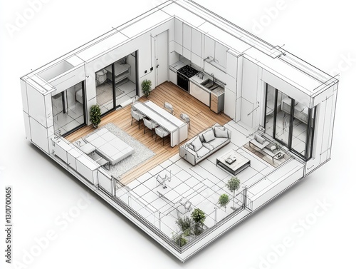 A modern, open-plan living space featuring a kitchen, dining area, and lounge, illustrated in a clean, minimalist design.