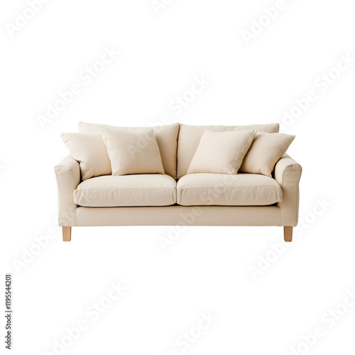 A modern, plush sofa featuring multiple cushions and wooden legs, Isolated on white background