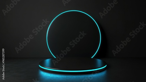 A modern, round black podium with a glowing neon blue outline, set against a dark, minimalist background.