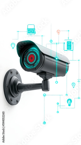 A modern security camera mounted on a wall, integrated with digital icons representing surveillance technology and connectivity.