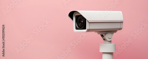 A modern security camera mounted on a wall, set against a soft pink background, emphasizing surveillance technology.