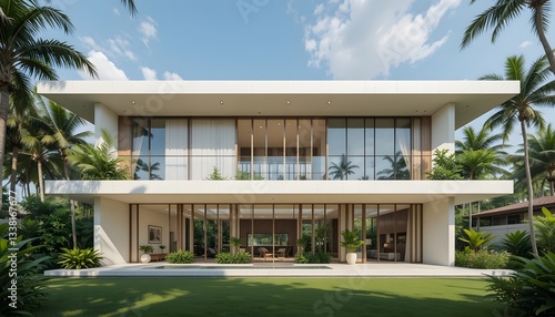 A modern, stylish house with large glass windows, surrounded by greenery, showcasing contemporary architecture and a serene outdoor space.