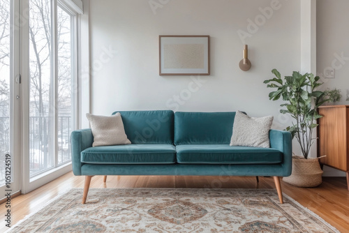 A modern teal sofa with decorative pillows sits elegantly in bright living room, surrounded by natural light and greenery, creating cozy atmosphere