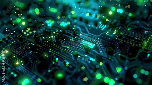 A modern tech-inspired background with digital elements, circuitry patterns, and a futuristic color scheme of neon blues and greens