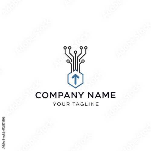 A modern technology logo featuring a circuit board design emerging from a hexagon with an upward arrow.