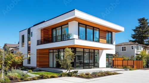 A modern two-story house with white and wooden design, large windows, covered porch, fenced yard, clear skies, and neighboring single-story homes nearby.