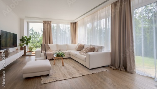 a modern white living room interior. Showcase the beauty of the room with large, billowing curtains on the window that bring in soft natural light.