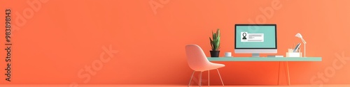 A modern workspace featuring a computer, plant, and lamp against a vibrant orange wall, ideal for inspiration and productivity.
