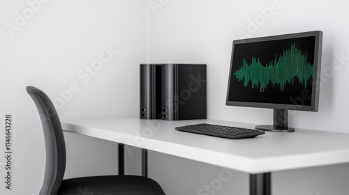 A modern workspace featuring a monitor displaying sound waves, a keyboard, and a sleek desktop with a black computer tower and a minimalist chair.