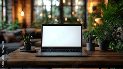 A modern workspace with a laptop and decorative plants.