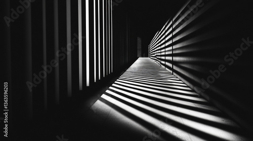 A monochrome image showing light and shadow patterns from vertical bars on a surface and wall