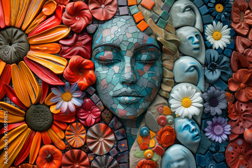 A mosaic artwork composed of colorful tiles representing various cultural symbols and motifs. Concept of artistic diversity. Generative Ai.