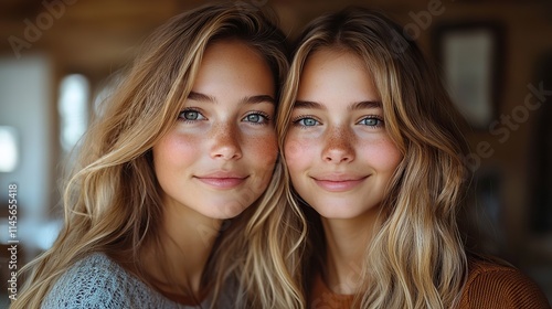 A mother and daughter hug and smile in a studio portrait, showing appreciation and support on Mother's Day.