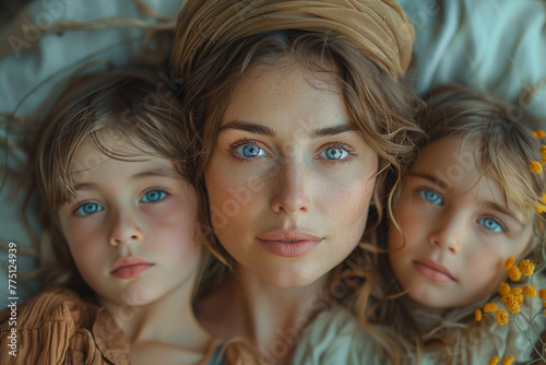 A mother and her grown-up children reminiscing about cherished memories from their childhood. Concept of maternal nostalgia and family reminiscence. Generative Ai.