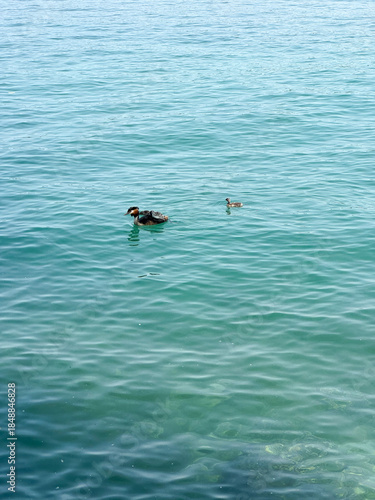 A Mother Duck and Her Duckling Swimming in Clear Blue Water