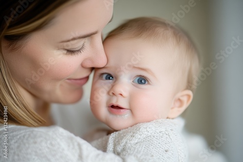 A mother lovingly gazes at her smiling baby, capturing a beautiful moment of connection and affection, emphasizing the bond between parent and child.