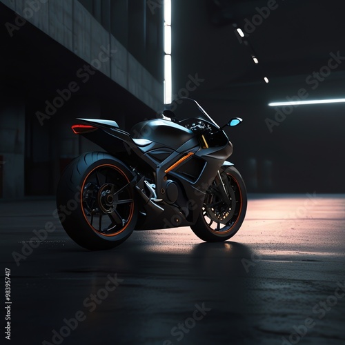 a motorcycle is parked in a dark room with a light on the wall.