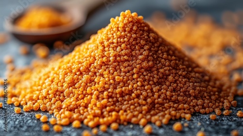 A mound of orange granules resembling a spice or seasoning.