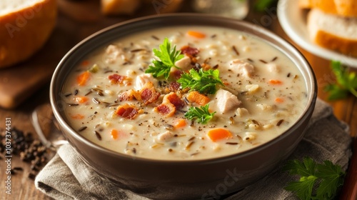 A mouthwatering bowl of creamy chicken and wild rice soup garnished with crispy bacon and chopped parsley, Soup bowl centered, Soft ambient lighting highlighting the richness