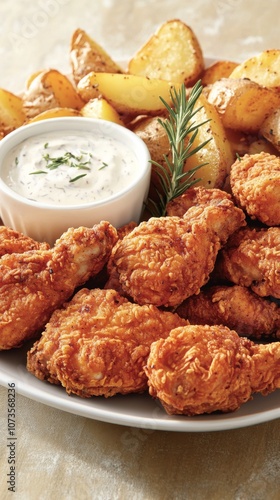 A mouthwatering platter of crispy fried chicken is complemented by herbed roasted potatoes and a side of creamy dipping sauce, perfectly served for a delicious meal experience.