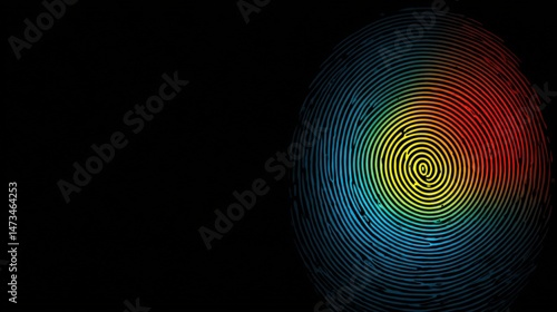 A multicolored fingerprint pattern appears on a black background, symbolizing identity, security, and technology.