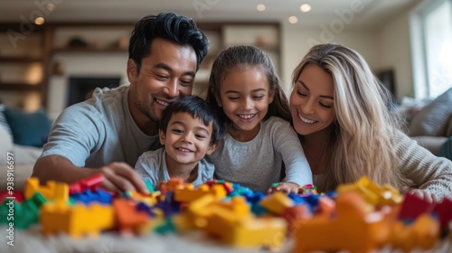 A multicultural family tidying up toys in the living room, turning cleanup time into a fun group effort