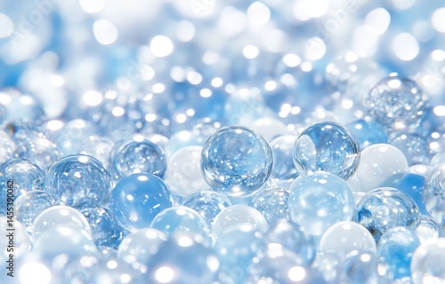 A multitude of translucent, light blue and white orbs, close-up Their smooth surfaces reflect light, creating a soft, glowing effect Various sizes and shades of the color palette