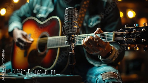 A musician playing an acoustic guitar in a cozy, illuminated setting.