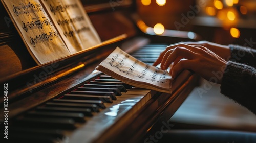 A musician practices on a vintage piano with sheet music in a cozy indoor setting
