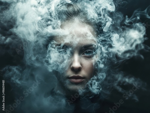A mysterious figure partially obscured by swirling smoke, creating an ethereal and haunting atmosphere.