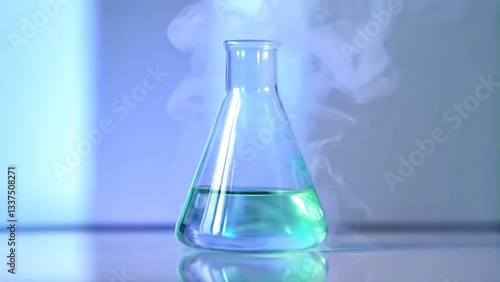 A Mysterious Swirling Vapor Rises From A Glass Flask Containing An Ethereal, Glowing Green Liquid Under Cool Blue Lighting