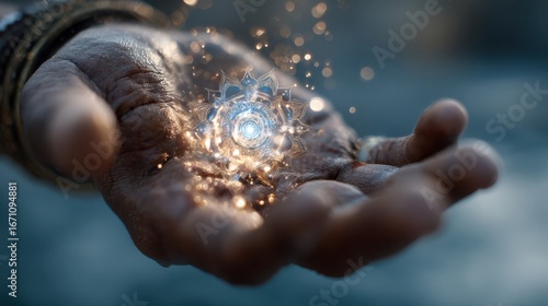 A mystical hand holds a glowing orb, surrounded by sparkling particles, evoking a sense of wonder and magic.