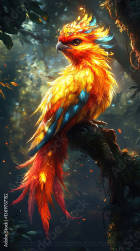 A mythical phoenix with vibrant feathers perched on a tree branch in a forest setting