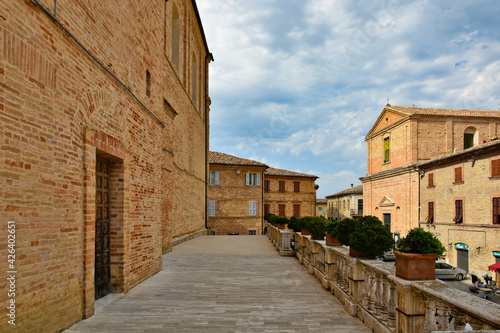 A narrow street between the old houses of Montecosaro, a medieval town in the Marche region of Italy.