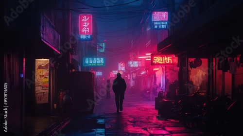 A narrow urban alleyway is depicted at night, illuminated by the vivid glow of neon lights. The scene is drenched in deep hues of blue and pink, casting an atmospheric, almost surreal ambience. Variou
