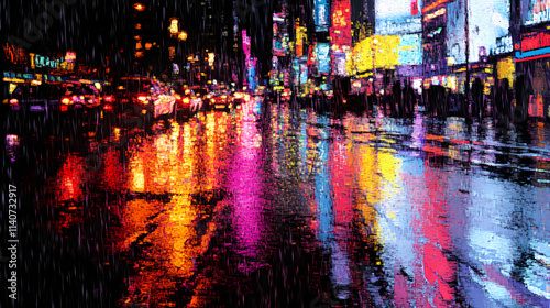 A neon-filled cityscape at night with rain-soaked streets and reflective surfaces. Reflective. Illustration