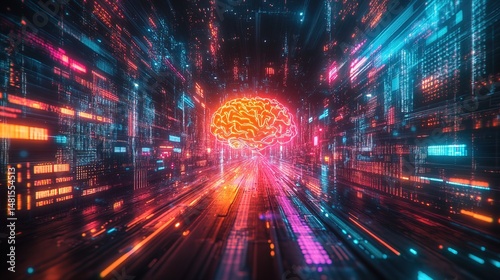 A neon-lit AI brain processing glowing streams of data in real time