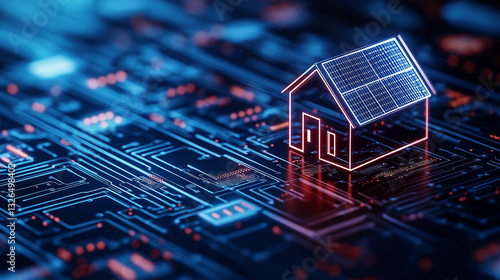 A neon-outlined house standing on a circuit board, its solar panels channeling energy into the grid, symbolizing the seamless connection between modern technology and renewable ene