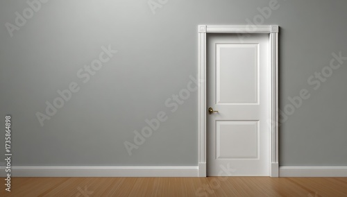 A neutral, minimalist interior room featuring a plain white door against a light gray wall.