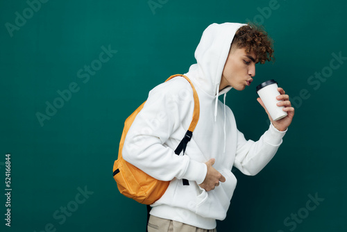 a nice man stands on a green background in a white hoodie with an orange backpack on his back and holding a glass in his hand drinks from it