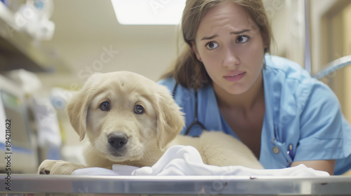 A nurse in blue scrubs looking sad, sitting by a golden retriever puppy in a stainless steel cart at an animal hospital, with a white cloth beneath, both frowning at the camera.