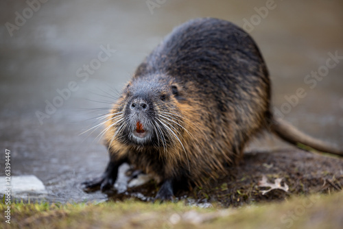 A nutria or coypu (Myocastor coypus) stands on the bank of a frozen pond