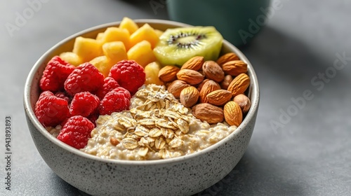 A nutritious bowl of oatmeal topped with fresh fruits, nuts, and seeds, perfect for a healthy breakfast or snack.