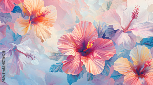 A painting of pink and yellow flowers with a blue background
