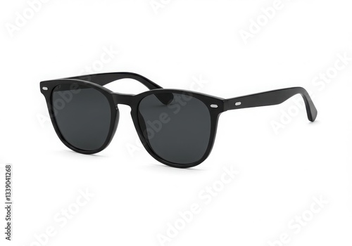 A pair of black framed sunglasses with dark lenses on a plain white background in a studio shot
