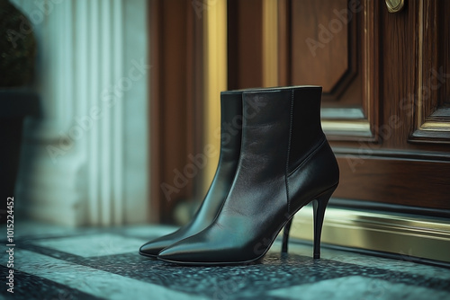 a pair of black short leather ankle high heels boots placed in front of a condominium door.