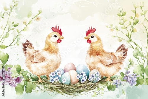 A pair of domestic chickens standing side by side, likely friendly or socializing